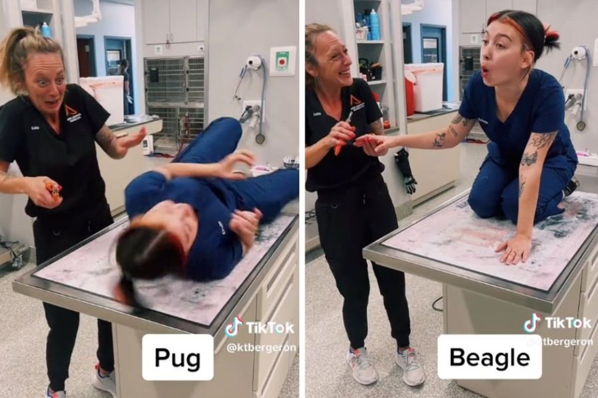 A TikTok video from @ktbergeron shows what appears to be two vet techs doing a reenactment of how different dog breeds respond to having their nails clipped, and it's hilariously spot-on.